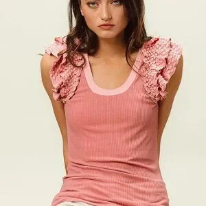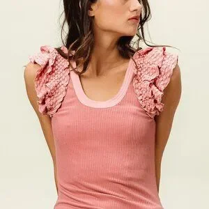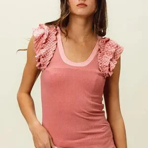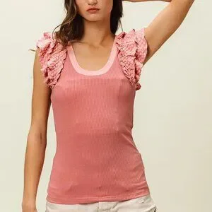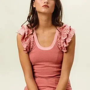*This elegant cami tank features luxurious lace ruffle sleeve details that add a romantic feminine touch to the classic ribbed knit design. Made from soft stretchy cotton blend fabric with a flattering scoop neckline and fitted silhouette. The dusty pink color creates a sweet vintage-inspired look perfect for casual outings or layering. The ribbed texture provides comfort and flexibility while the intricate lace trim elevates the overall style making it suitable for both everyday wear and special occasions.