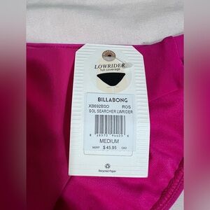 NWT Billabong Sol Searcher Low Rider Full Coverage Pink Bikini Bottom Sz M NEW! As you can see in the last picture, the tag is attached but barely. I was going to sew it back on, but didn’t want to ruin the stitching. And I figure with the size of that tag, most people won’t want it in there anyways! Waist 14.5”. Hygienic liner is attached.