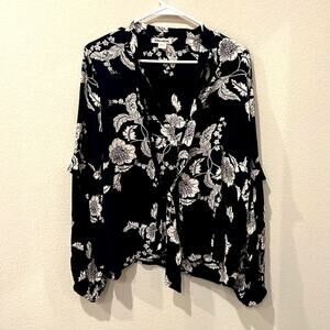 Soft, flowy floral neck tie blouse. Cute ruffle on sleeve with lower balloon sleeve. Thin gauze like fabric. New with tags!