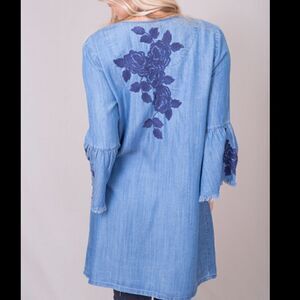 The Rose Embroidered Jacket, made by Billy T, is a simple chambray bed jacket decked out in fringe around the cuffs and front drape. Throw on over your favorite t-shirt to dress it up a bit. 100% lyocell. Machine wash in cold water and tumble to dry on low heat.