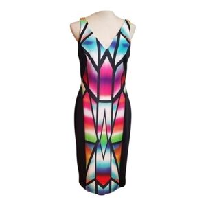 This dress is a sleeveless, knee-length dress with a vibrant stained glass window pattern. The dress has a deep V-neckline and a fitted silhouette, zippered back. It features a striking geometric pattern design. The base of the dress is black, with panels of vibrant rainbow gradient colors creating an Art Deco-inspired or stained glass window effect. The colors in the gradient pattern include orange, red, turquoise, green, and white, arranged in symmetrical geometric shapes divided by black lines.The pattern features bright colors like red, orange, yellow, blue, and purple, with black outlining the shapes.