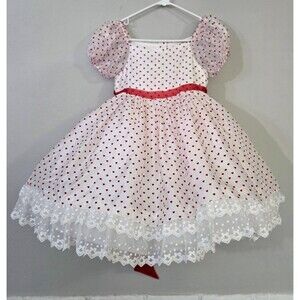 This dress is made of white shimmer organza with flocked red hearts. It has puffy sleeves and an adorable button up back with red heart buttons. Sash is red organza. The skirt has a double layer lace hem with a full horsehair braid petticoat. Dress comes fully lined.