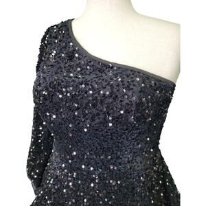 Perfect party dress, black sequin one sleeve asymmetric style dress. Zip closure. Measurements in photos.