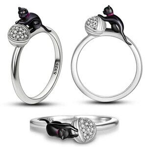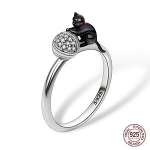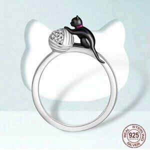 NWT Black Cat With Yarn Ring S925 Sterling Silver Stamped Sz.6