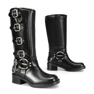 NWT Black DREAM PAIRS Knee High Side Zipper Motorcycle Boots Silver Buckle SZ 7