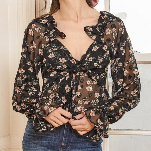 NWT Black Floral Print Ruffle Tie Front Top-Sheer