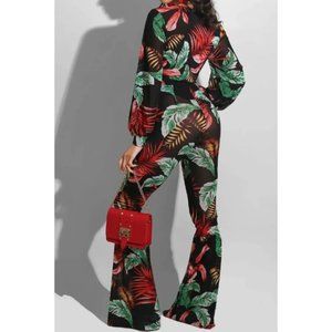 NWT Black Green Red Tropical Aloha Long Sleeves Deep V-Neck Vacay Bae Jumpsuit