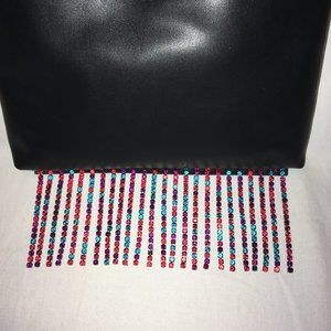 Solid black hobo bag with zipper closure. One zippered compartment inside and two card holders. Multi -colored rhinestone fringes dangle from the bottom.