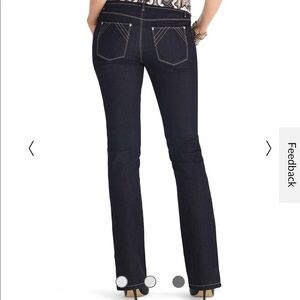 Our straight fit. Straight through the hip and thigh, features a low rise, and sits lower on the waist. 5-pocket style with rhinestone rivets. Front zip with double engraved shank closures. Belt loops. Inside waistband inscribed with "Feel beautiful".