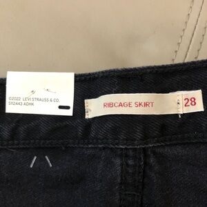 New with tags, never worn black Levi's ribcage skirt, size 28. Button fly, pre-distressed. 15.5 inches long, 29 inch waist, 38 inch hips. Retailed for $79.50. This skirt is no longer available from Levi's.
