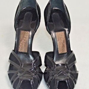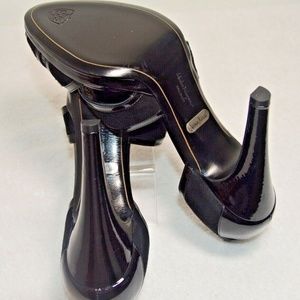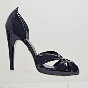 Brand new never worn stunning combination of suede and patent leather open-toe cage D' Orsay platform pumps.