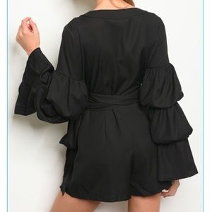 You will fall in love! This romper can be tied on the back, side, front, whenever you want the tie to be! The V-Neck can be adjusted to show cleavage or not show! The tie adjusts the V-neck! EXTRA PRO - it has POCKETS! New with tags! Long puff sleeve v-neck belted romper. Fabric Content: SELF: 97% POLYESTER 3% SPANDEX LINING: 100% POLYESTER