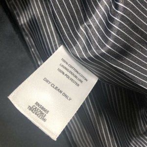 Features: One-button closure, Notched lapels, Long sleeves with 3 buttons, Front flap pockets, Blue pinstripe fabric lining.