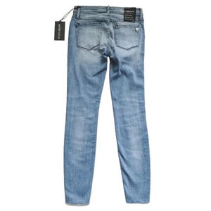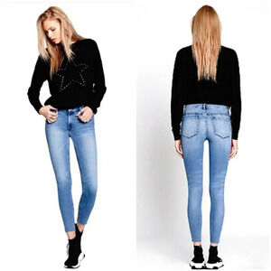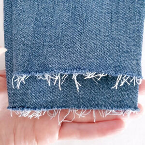 Light blue Splash House wash. Distressed ankle hem and pockets. Faded legs. Cropped ankle length.