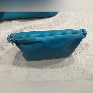 A large turquoise removable zipper pouch, measuring 13" W x 10" H x 4" D provides additonal storage