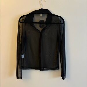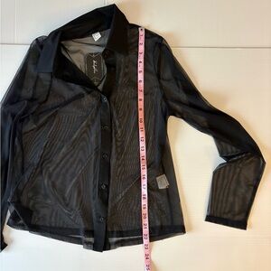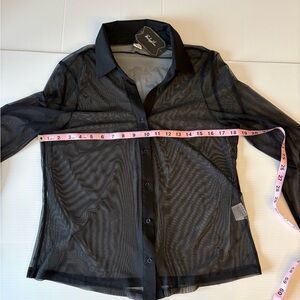 This black sheer button-down shirt offers a stylish and versatile look. Ideal for both casual and formal settings.