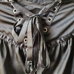 Highly tailored with a front yolk detailed with black ribbon. The back corset styled lacing makes this item quite adjustable and once you get it to your perfect fit it also has a convenient side zipper, The front is slightly elevated and the back is much longer and has a slight train. Great for dark or gothic weddings, reenactment, cosplay or high fashion and great with ankle boots. I believe this is the last black in stock.