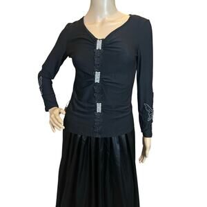 NWT Black Silk Rhinestone & Lace Whimsigoth Top SZ XS/Small Y2K Glam Romantic