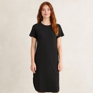 t-shirt dress, midi dress, short sleeve, black, ebony, jet black, solid color, jersey fabric, cotton blend, soft fabric, lightweight, relaxed fit, casual, minimalist, versatile, everyday wear, loungewear, travel outfit, summer style, spring fashion, chic, modern, effortless, trendy, streetwear, timeless