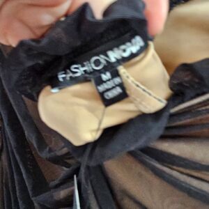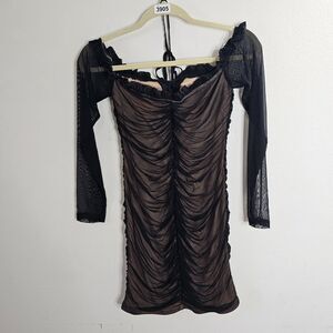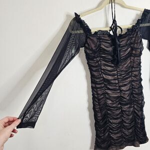 NWT Black and Nude Maura Mesh Ruched Off-Shoulder Long Sheer Sleeve Mini Dress M
