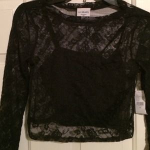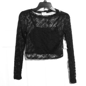Black sheer lace, long sleeve crop top. Has attached black crop cami. New with tags