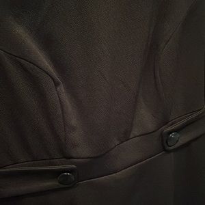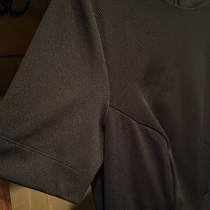 NWT. Black. Medium fitted dress. Split at the back hem. Button details at the waist. Zipper for closure. Short sleeve. Stretchy material. Delicate pattern in the material.