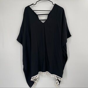 NWT Black with White Tassel Fringe V Neck Beach Swim Kaftan Cover Up