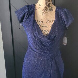 New with tags. Gabby Skye Occasion dress. Black/Blue shimmer. Soft Stretchable, classic and sexy drapes. Faux wrap style with black inner slip. I am 5'3" and hits me med calf