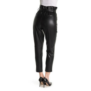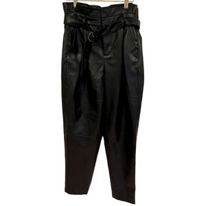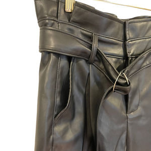 - Faux leather construction - Paperbag waist - Self tie sash belt - Belt loops - Side slit pockets - Front pleats - Straight leg - Hidden zip fly with hook and bar closure - Approx. rise 13", inseam 27" - Imported