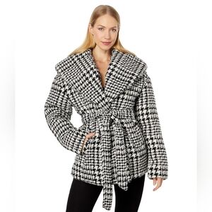 Stylish houndstooth puffer with a cozy fit. Features a belted waist for added flair.