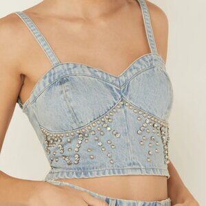 NWT Blank NYC Starstruck Denim Bustier - Sweetheart Neckline, Embellished with Studs & Rhinestones, Smocked Back, Adjustable Shoulder Straps, Side Zipper