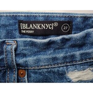 This is a pair of women's BLANKNYC shorts in a size 27, featuring a mom style with a medium wash denim fabric. The shorts have a raw hem and distressed detailing, perfect for casual occasions in the summer and spring seasons. Made from 100% cotton, these blue shorts have a waist size of 27 inches.
