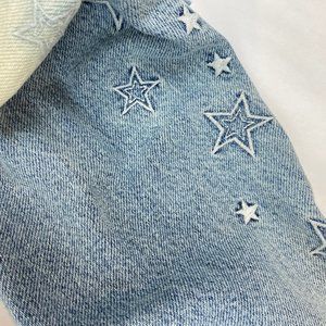 Jean bleach dyed jacket features distressing throughout, frayed/distressed hem, embroidered stars on sleeve and back.