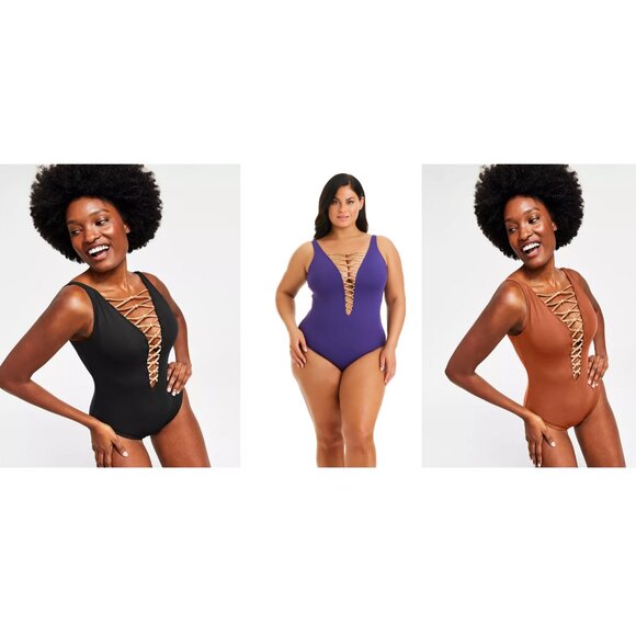 For your next beach getaway, pack this flattering lace-up number from Bleu by Rod Beattie. Featured with lacing detail at the plunging neckline and back, this beach look will be your chicest one yet.