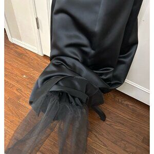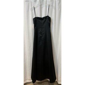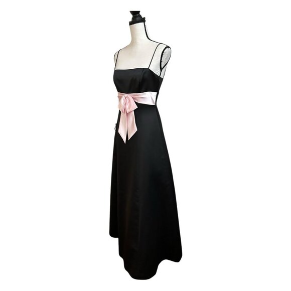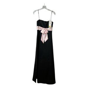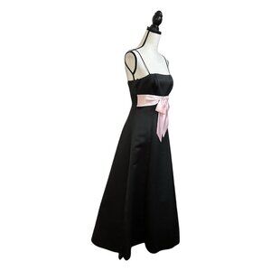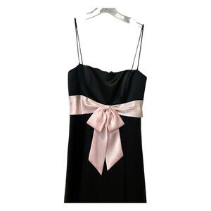 New and ready for your special occasion. Precious dress with spaghetti straps and a big pink bow. Satin Dress with back zipper, structured bodice. 100% polyester with 100% acetate lining. The bottom of the lining features crinoline mesh to add volume and structure to the skirt of the dress. MSRP is $169 size 5