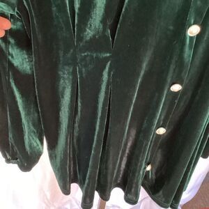 The material is a rich forest green velvet. It has pretty pearl buttons which button up the front. The front of the jacket is pleaded for a Flattering look! The sleeves are long and full with elastic at the bottom.