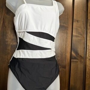 one-shoulder swimsuit in classic black and white. Perfect for a stylish beach day.