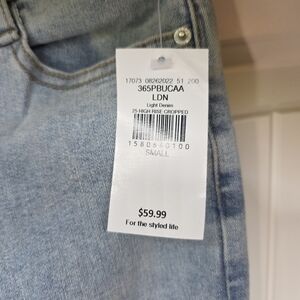 The NWT Blue B Collection Rhinestone Fringe Denim Jeans in size S are a stylish and trendy addition to any woman's wardrobe. These high-rise, cropped jeans feature a 10-inch rise and a 25-inch inseam, offering a fitted and flattering fit. Made from a blend of 65% cotton, 30% polyester, and 5% spandex, these light wash denim jeans are accented with fringe and rhinestone details, adding a touch of glam to any outfit. Perfect for various seasons, these jeans are ideal for those looking to make a statement with their fashion choices.