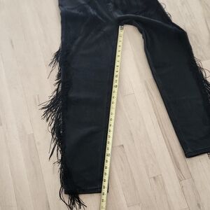 Fringe along the leg sides and framing the front pockets (some fringe is missing below the pocket on the left side, see last picture, barely noticeable when worn)