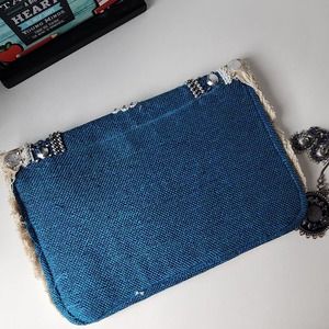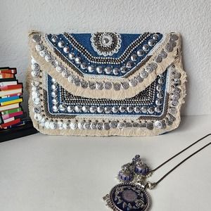👛 Our Indian blue-colored coin and beaded detail boho clutch is made on jute fabric . This stunning Indian coin, sequins, beads and embroidery detail boho clutch is the ideal accessory for adding a dash of exotic flair to your outfit. The eye-catching colors and intricate coin detail will set you apart from the crowd. This boho clutch is sure to turn heads whether you're attending a special event or just going shopping around town.