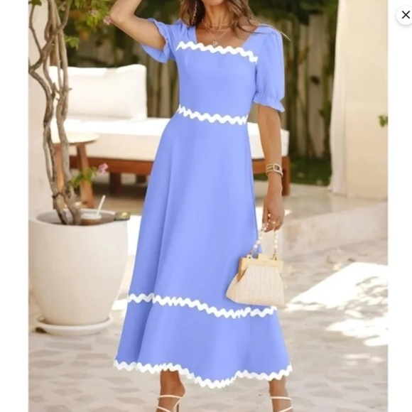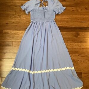 NWT Blue Maxi Dress w/ White Ric Rac Tie Back Smocked Puff Sleeves Size S