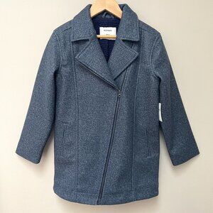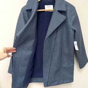 NWT old navy blue herringbone trench coat or overcoat with big collar and asymmetrical zipper. Front welt pockets. Partially sherpa lined. Super soft! Size 6-7.