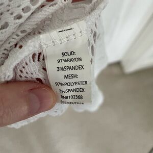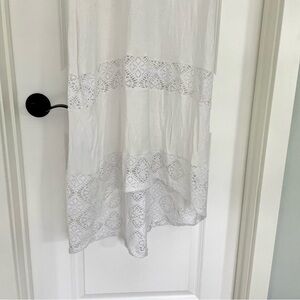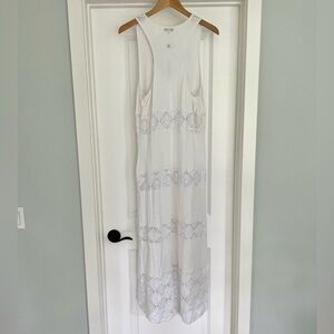 This beachy maxi dress is new and in excellent condition! Dress features lace mesh stripping. Would make a great swimsuit cover up too!
