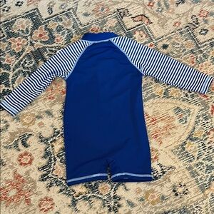 Stylish kids' swimsuit with blue and white stripes. Perfect for beach or pool days.