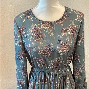 This vibrant dress features a pleated design with an elastic waist, perfect for casual or work settings. The long sleeves and crew neck add a touch of elegance, while the blue and tan hues make it a standout piece. Ideal for those seeking a stylish yet comfortable dress.