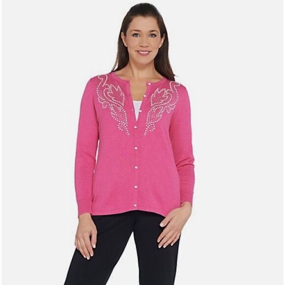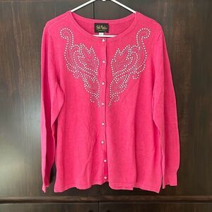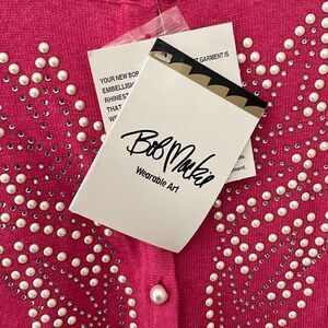 This sweater is made by Bob Mackie. It’s a bubblegum pink button front cardigan with rhinestone and pearl detailing and pearl buttons. Size large and NWT. Smoke and pet free home.