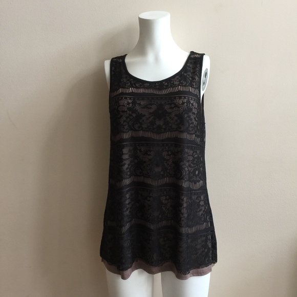 Beautiful Bobeau lace blouse in black with taupe/brown underlay. Casual, contemporary, chic! Self: 100% nylon; contrast: 100% polyester.
