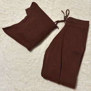 This brown ribbed Bobi set offers ultimate comfort with a touch of understated style. The soft, ribbed knit drapes beautifully, creating a flattering silhouette. The long-sleeve top features a classic round neckline, while the high-waisted pants boast an elastic waistband and adjustable drawstring for a perfect fit. Ideal for relaxing at home or running errands in style, this loungewear set is a cozy essential for any wardrobe.