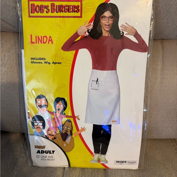 Transform into Linda from Bob’s Burgers with this Spirit Halloween costume. Includes glasses, wig, and apron. Never been worn and still intact in package. Perfect for Halloween fun or any costume occasion. One size fits most. Just need to throw on some leggings or jeans with sneakers, and your costume is complete.