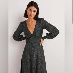 NWT Boden Black Metallic Midi Dress. Size 10 petite. Long sleeve. Twist detail at chest. Lined.